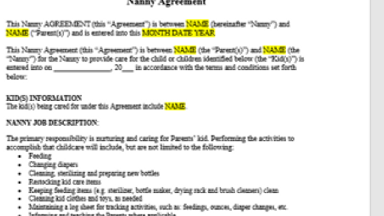 Like Goldilocks we created this Editable Sample Nanny Agreement so it's "just right": it not too long and confusing that your head spins, nor too short and lacking important details you wonder if you'd need to address down the line.